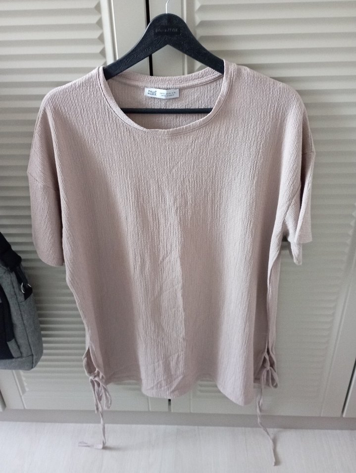 Bej keten kumaştan, kısa kollu ve yuvarlak yakalı, bol kesim kadın bluz. Normal boyda ve yanlarda bağcık detaylı, rahat ve şık görünümlü.