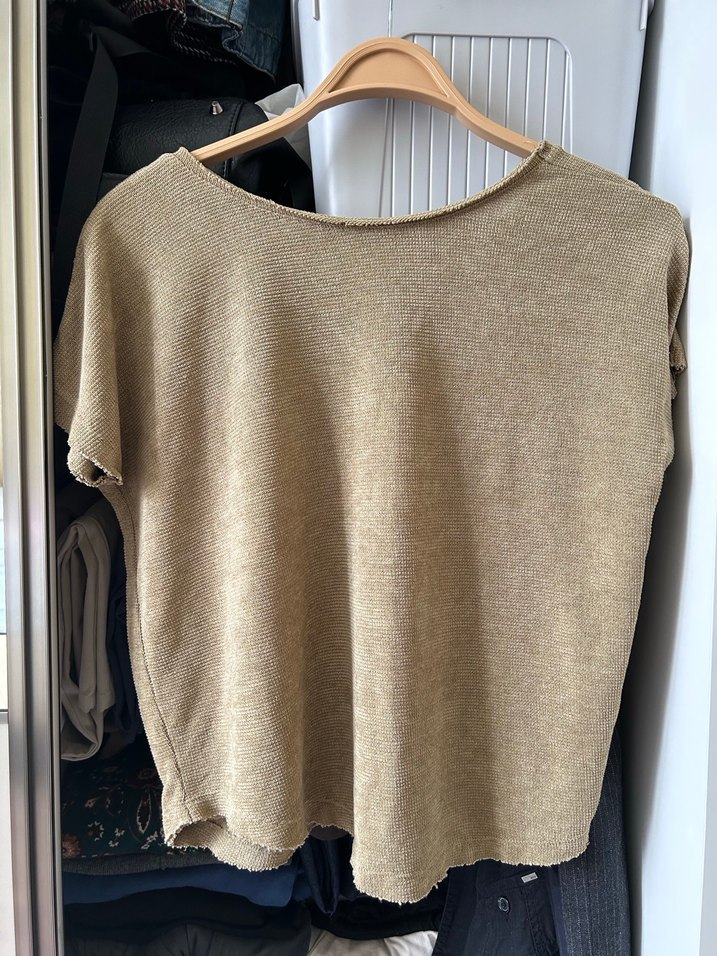 Bej renkli keten kumaştan, kısa kollu ve salaş kesim, günlük rahat kullanım için uygun bir kazak.