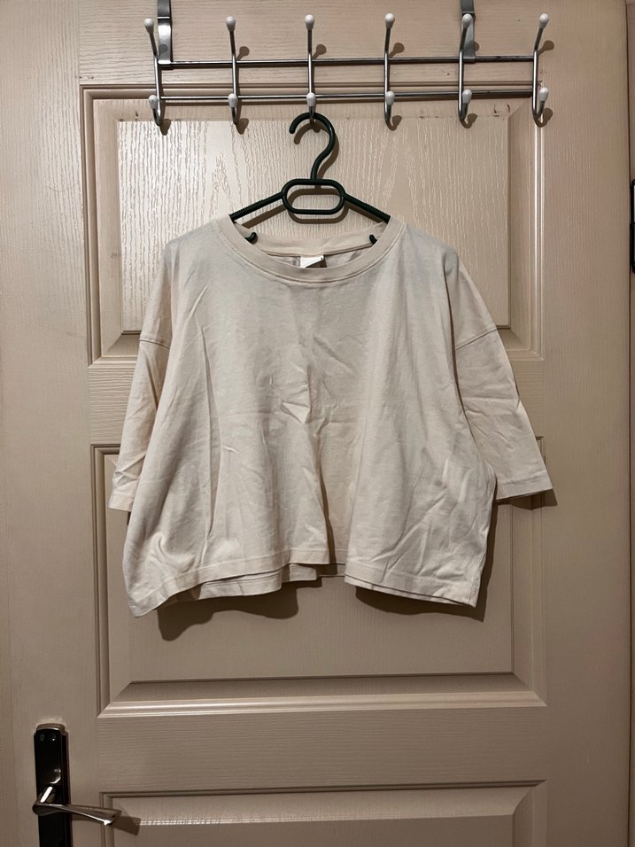 Bej keten kumaştan, kısa kollu, salaş kesim, bisiklet yaka ve normal midi boyda, desensiz günlük kullanıma uygun kadın tişörtü.