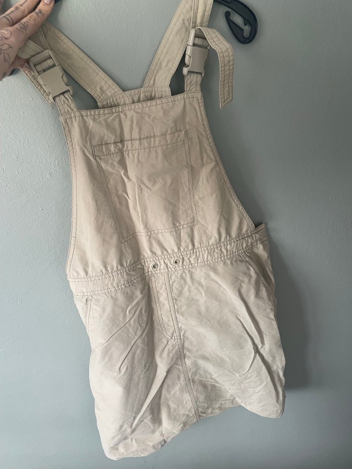 Bej keten kısa salopet, oturan kesim ve tokalı halter yaka askılarla. Midi boy, günlük rahat kullanım için uygun.