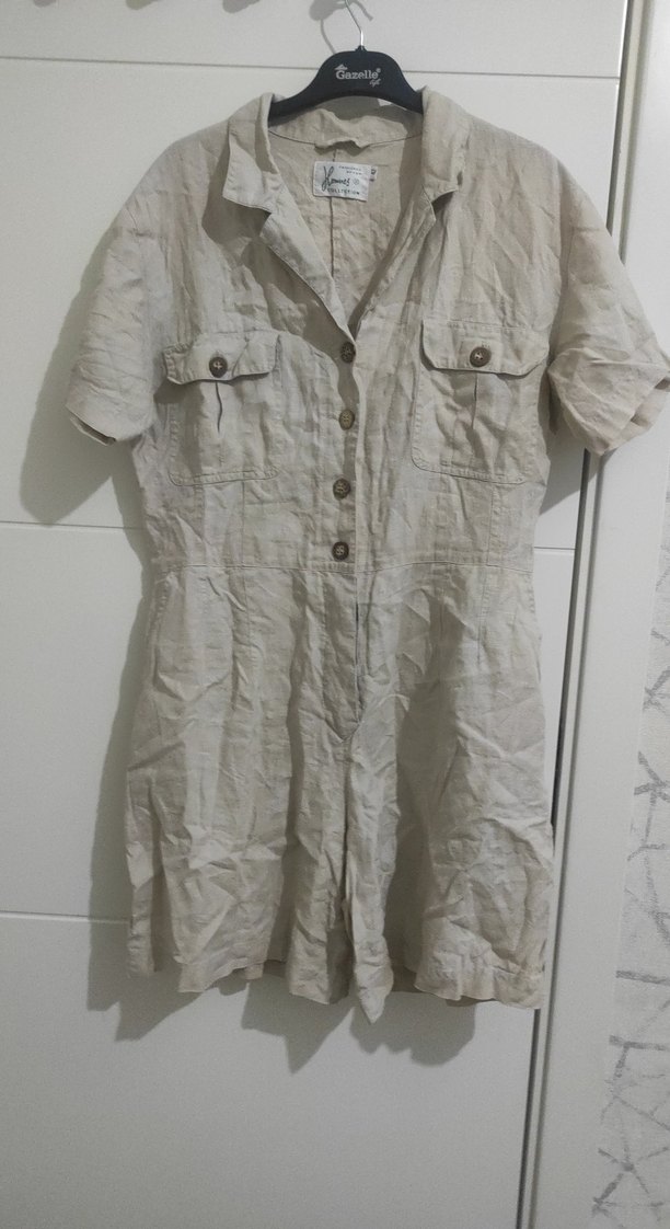 ürün sıfırdır sadece denendi . etiketi yoktur.Keten kumaştan, bej renkli, kısa kollu, düğmeli ve yakalı, bol kesim kadın tulumu. Günlük kullanım için uygundur. boy 92 iki koltuk arası 52