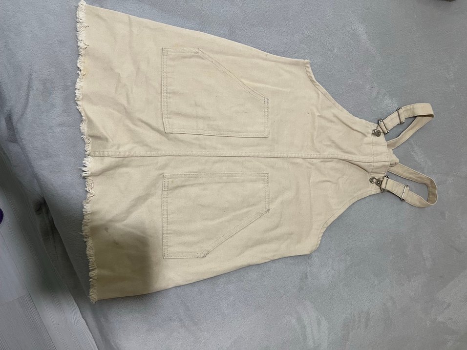 Bej keten kumaştan, kolsuz, midi boy ve bol kesim tulum. Yüksek yakalı, iki adet arka cepli, günlük kullanıma uygun sade tasarım.