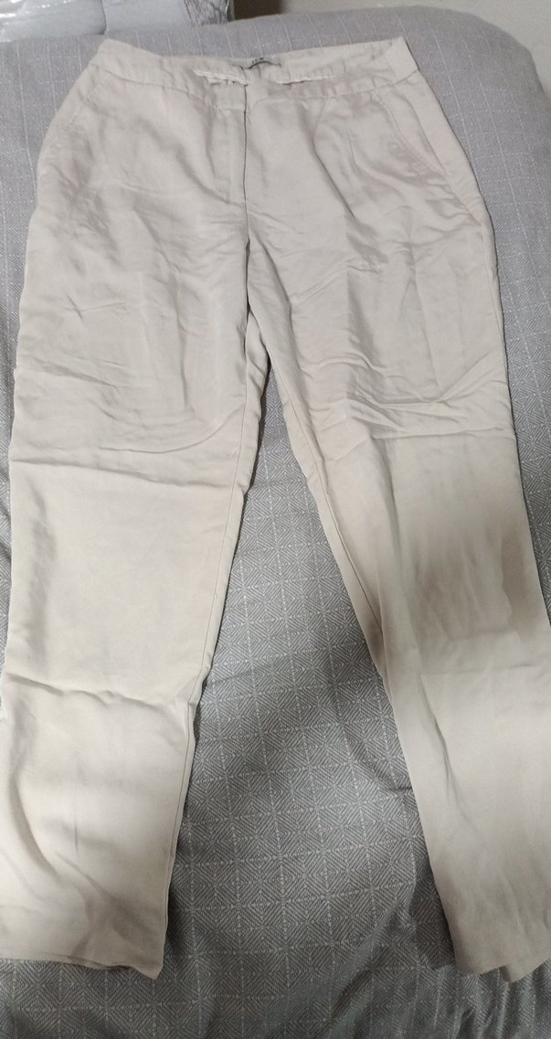 Bej keten kumaştan, regular fit ve midi boy kadın pantolon. Desensiz, gündelik rahat kullanım için zahmetsiz şıklık sunar.