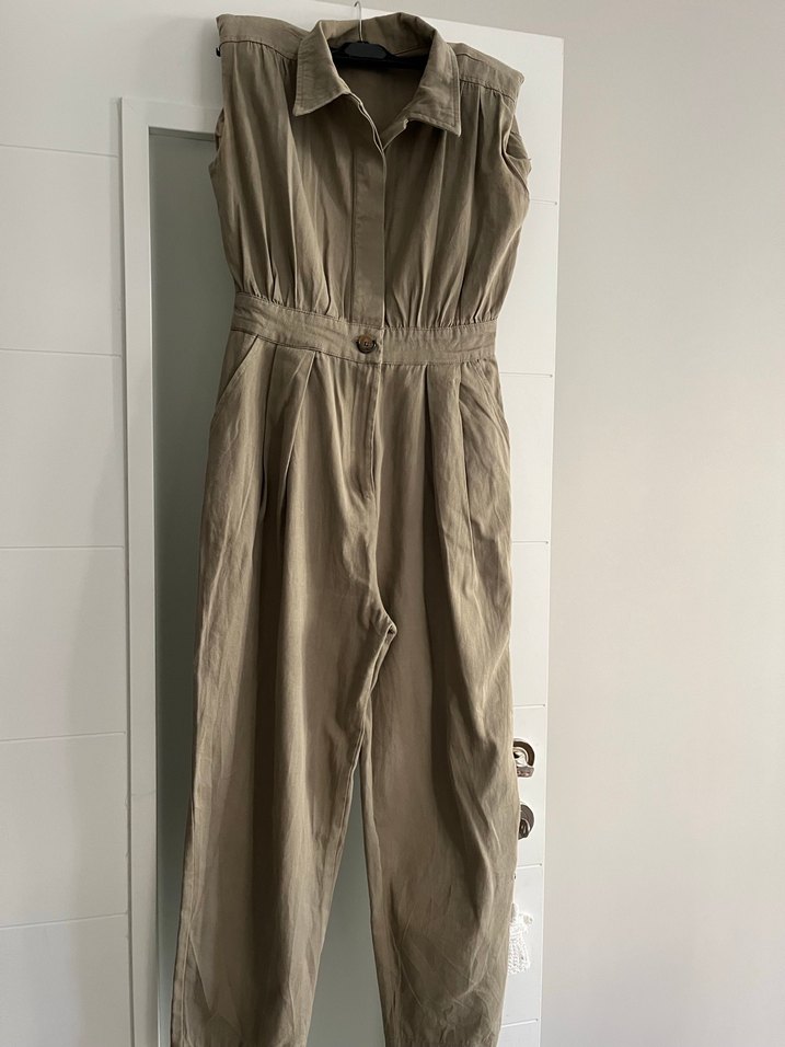 Keten kumaştan, kolsuz ve yüksek yakalı bej tulum. Günlük kullanım için minimalist ve zahmetsiz şıklık sunar.