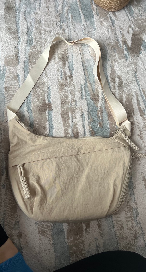 Bej keten kadın omuz çantası, fermuarlı kapanış ve ayarlanabilir askı ile minimalist, günlük sokak stili için uygun.