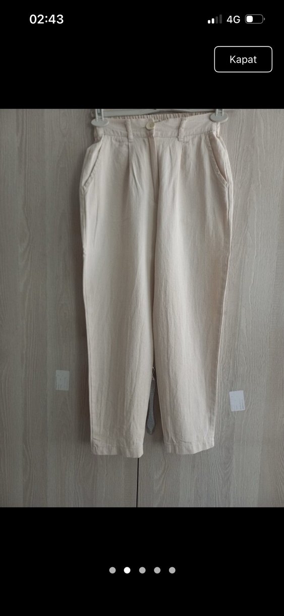 Bej renkli, keten kumaştan, midi boy ve bol kesim kadın pantolon. Minimalist tasarımıyla rahat ve şık, günlük kullanıma uygundur.