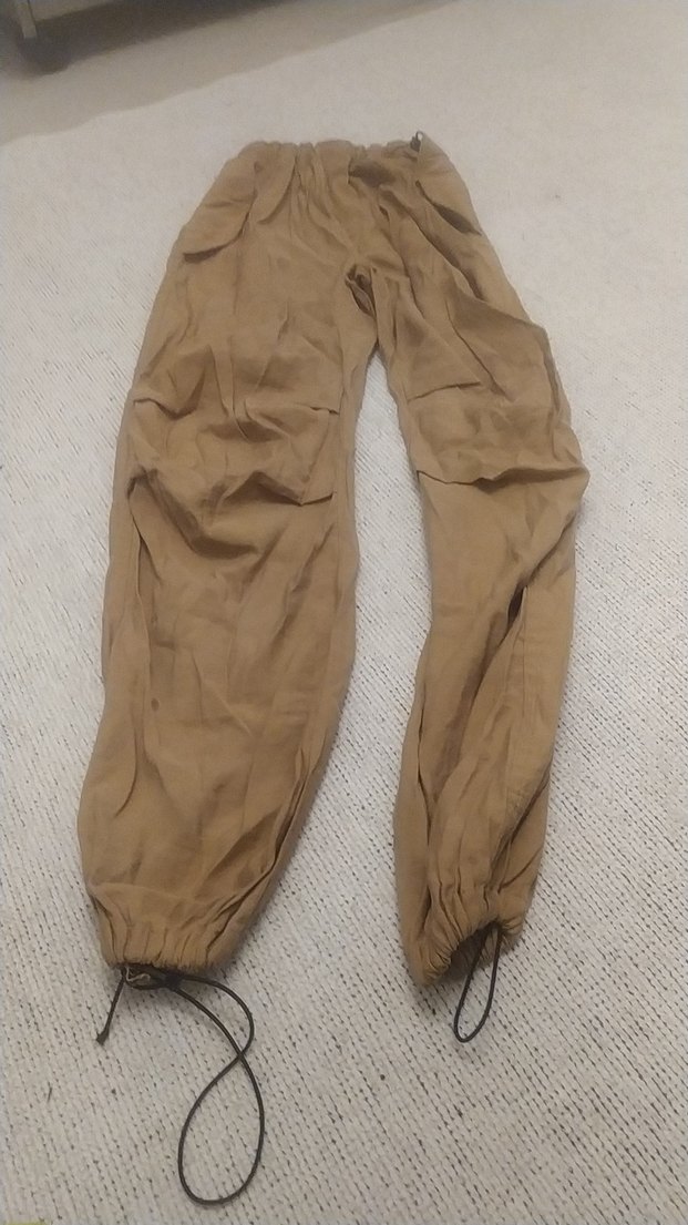 Bej keten kumaştan, kemerli ve rahat kesimli kadın pantolonu. Midi boyda, bileklerde bağcıklı, sokak stiline uygun, günlük dış mekan kullanımı için ideal.
