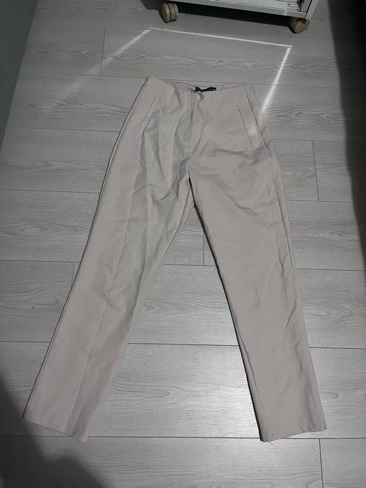 Bej keten kumaştan, normal boy ve rahat kesime sahip kadın pantolon, günlük kullanıma uygun şık bir sokak stili sunar.