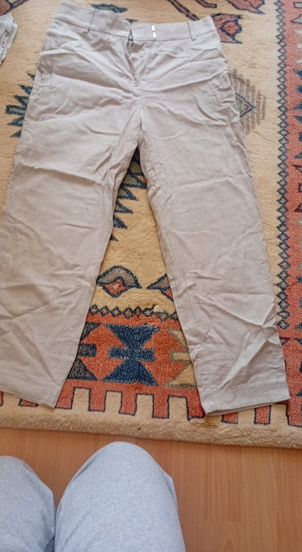 Bej keten kadın pantolon, rahat kesim ve midi boy. Desensiz tasarımı, gündelik kullanıma uygun zahmetsiz şıklık sunar.
