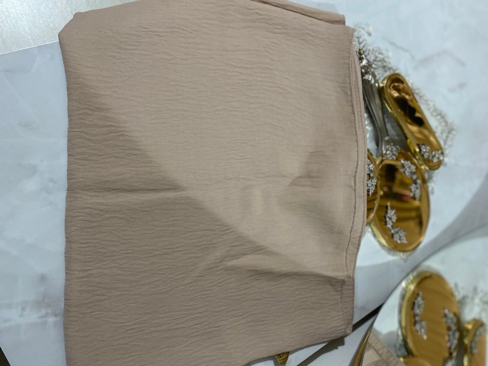 Yumuşak keten kumaştan, bej renkli, drapeli, bohem tarzda, minimalist ve sade tasarımlı kadın şalı.