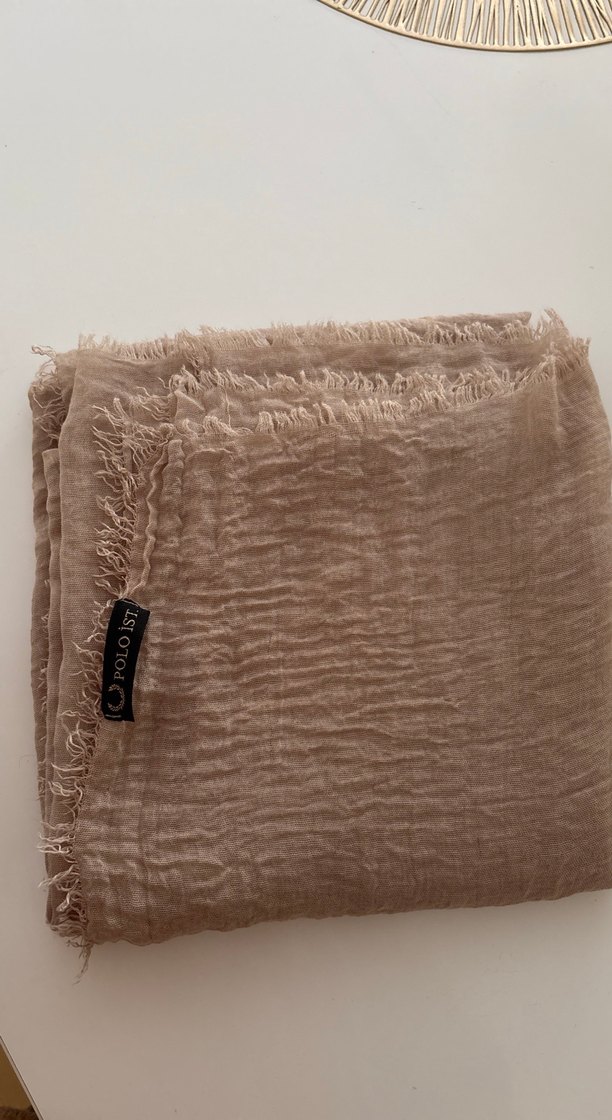 Bej keten kadın şal, drapeli tasarımı ve yumuşak dokusuyla bohem tarzına uygun rahat bir üründür.