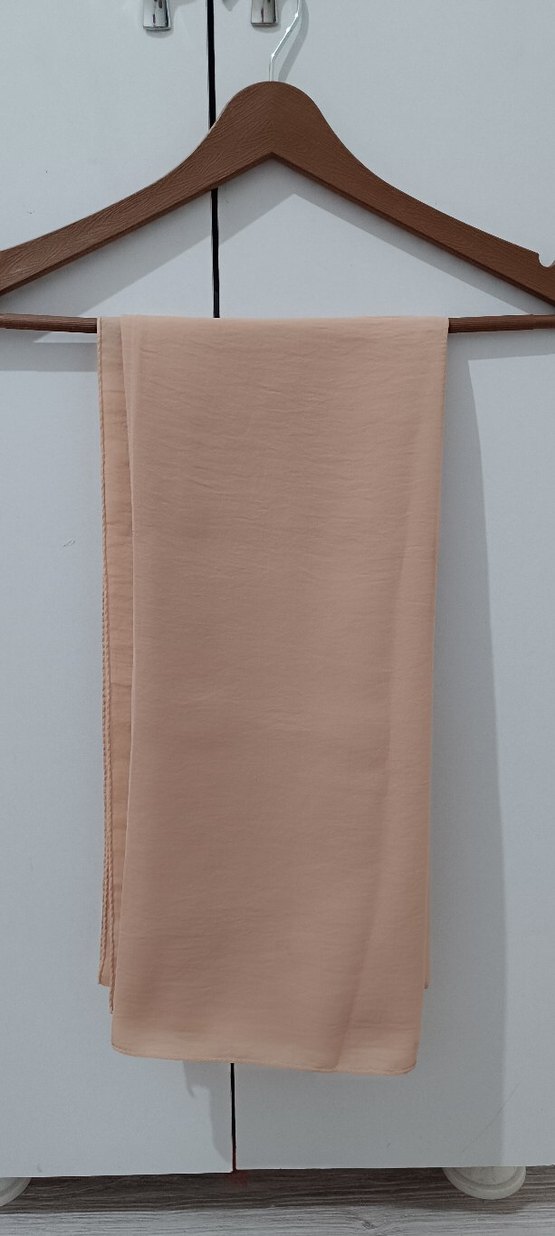 Bej renkte, keten kumaştan yapılmış, drapeli tasarıma sahip kadın şalı, minimal stil için uygun hafif ve yumuşak dokulu.
