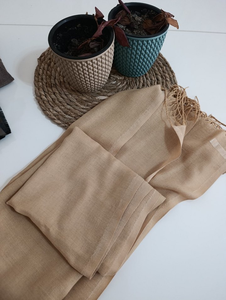 Hafif bej renkli keten kadın şal, rahat ve bohem tarzda. Yumuşak dokusu ve uç detaylarıyla zahmetsiz şıklık sunar.