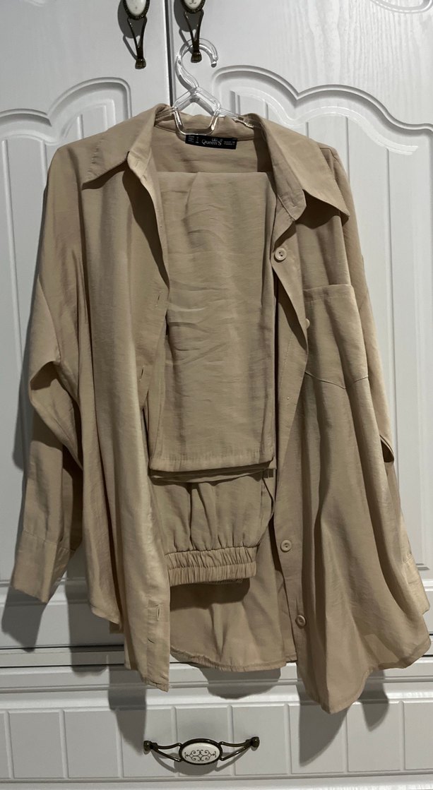 Bej renkte, keten kumaştan, salaş kesim ve uzun boyda kadın gömleği. Düğmeli ve yakası notched lapel, uzun kollu, günlük kullanıma uygun.