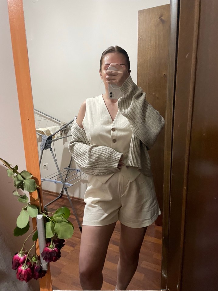 Bej keten mini hırka, kısa ve bol kesimdir. Uzun kollu ve straplez yaka ile gündelik kullanımda zahmetsiz şıklık sunar.