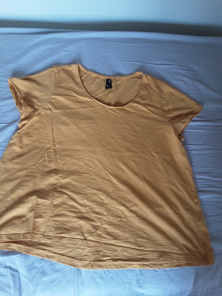 sarı renk, keten kumaştan yapılmış, kısa kollu, yuvarlak yakalı, salaş kesim kadın tişörtü. Günlük kullanım için uygun, parlak ve rahat bir tasarıma sahiptir.
