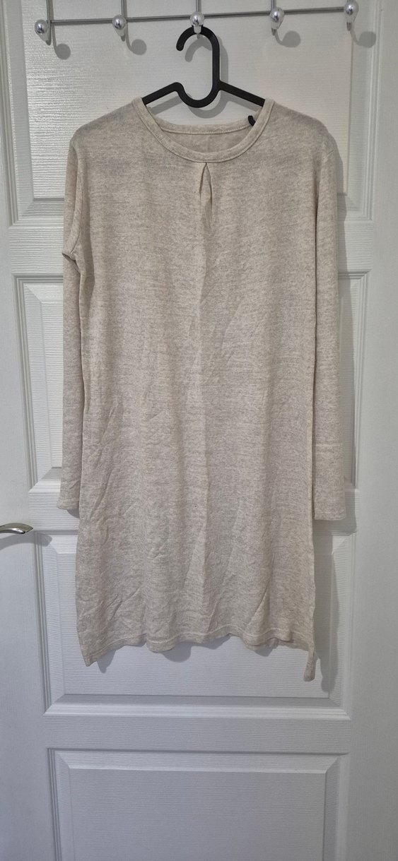 Yumuşak keten kumaştan, bol kesim ve uzun kollu kadın triko elbise. Drapeli, desensiz, yuvarlak yakalı ve midi boyda, rahat ve çağdaş tarz için uygun.