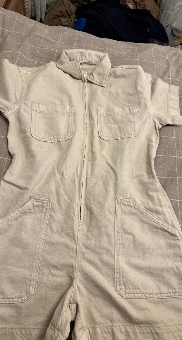 Kısa kollu, bej keten kumaştan salaş kesim tulum. Önde fermuar ve çoklu ceplerle günlük sokak stili için uygun.