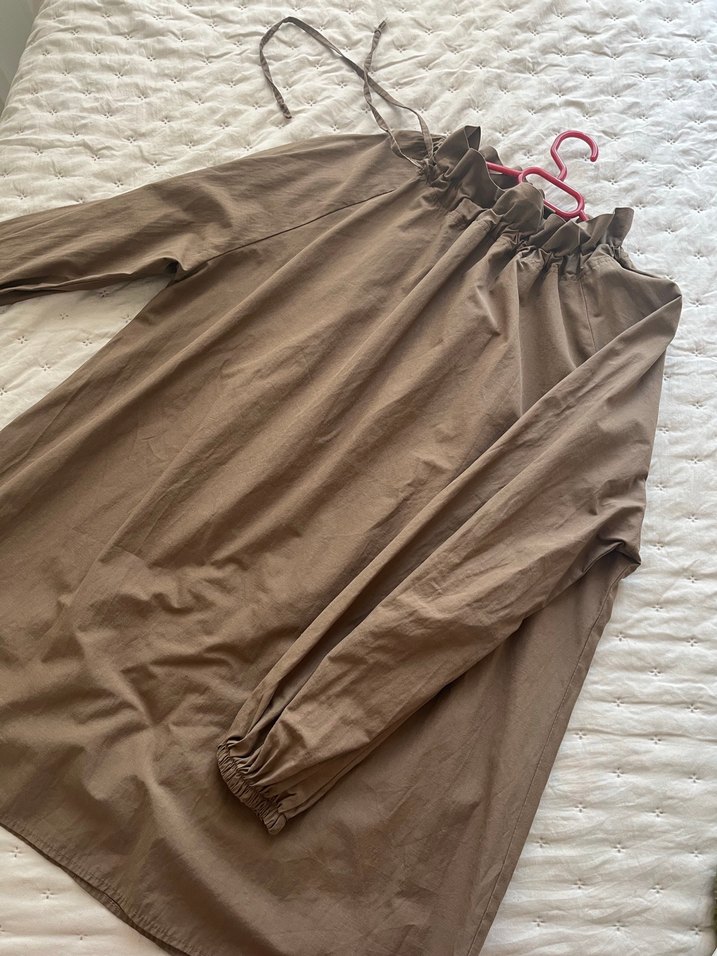 Bej keten kumaştan, ruffle yakalı ve uzun kollu, midi boyda bol kesim kadın tunik. Günlük kullanıma uygundur.