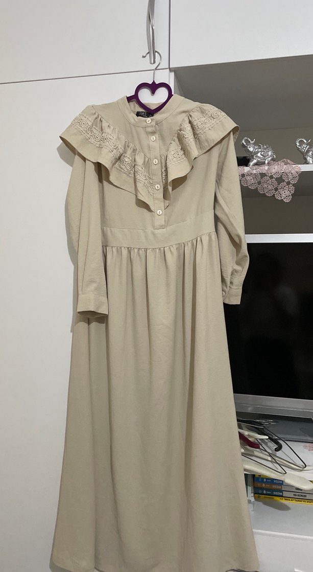 Bej keten uzun elbise, yakalı ve uzun kollu, bol kesimdir. Göğüste fırfır detayı ile vintage ve normcore tarz sunar.