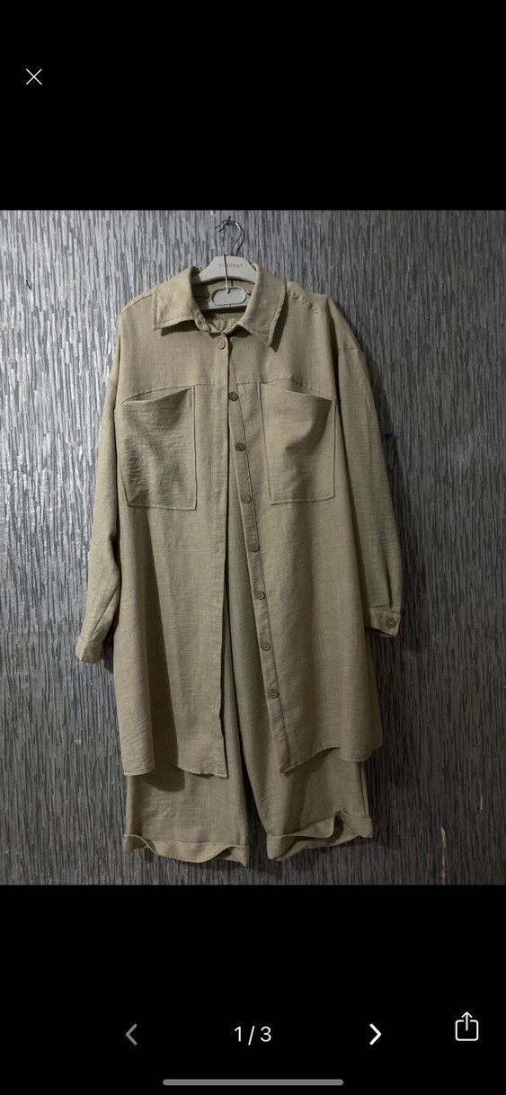 Bej keten kumaştan, uzun ve bol kesim, düğmeli, iki cep detaylı, uzun kollu, yakası kesik detaylı günlük rahat pantolonlu gömlek