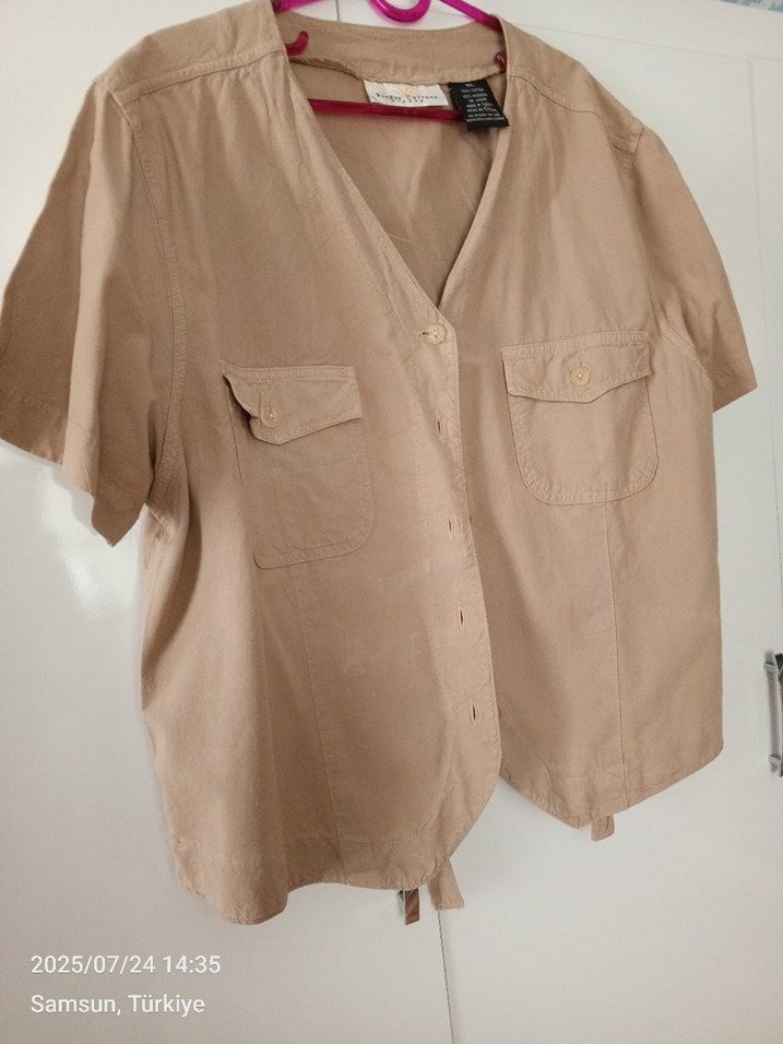 Bej keten kısa kollu, notalı yaka ve düğmeli cep detaylı, bol kesim mini gömlek. Rahat ve günlük sokak stili için uygun. marka temsilidir