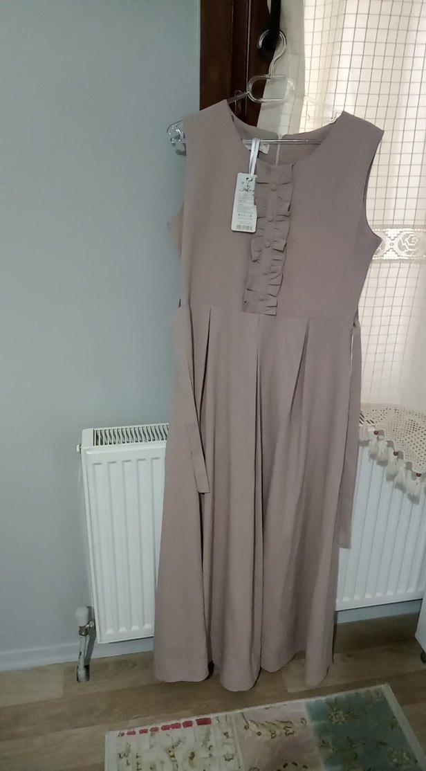 Bej keten kumaştan, kolsuz, V yaka ve fırfır detaylı uzun, bol kesim elbise. Minimalist ve normcore tarzda günlük kullanıma uygun. belli belirsiz bir iki leke mevcut yıkanınca çıkar diye düşünüyorum