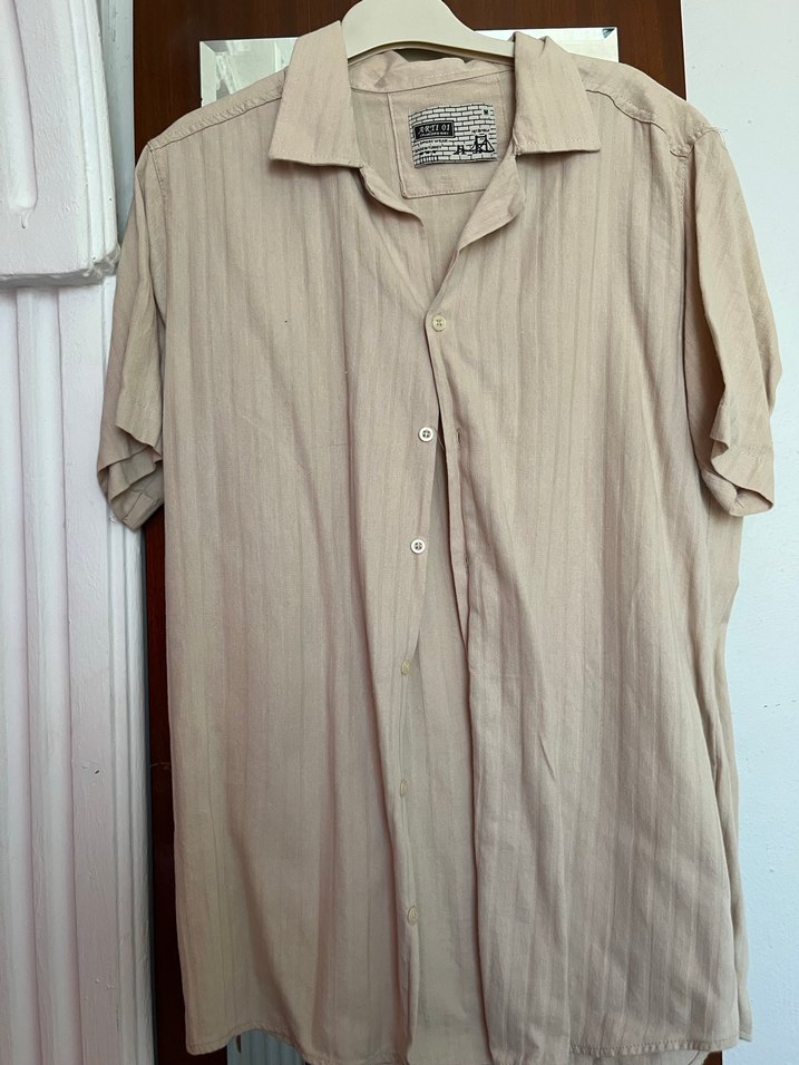 Bej renkli keten, kısa kollu erkek gömlek. Düğmeli ön kısmı ve yakalı tasarımı vardır. Rahat, bol kesim ve hafif desenlidir. Ofis ve günlük sokak tarzı için uygundur.