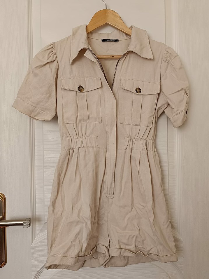 Hiçbir kusuru yok Bej keten kısa kollu mini tulum, yakalı ve düğmeli ön detaylıdır. Belden büzgülü, salaş kesim ile günlük sokak stili için uygundur.