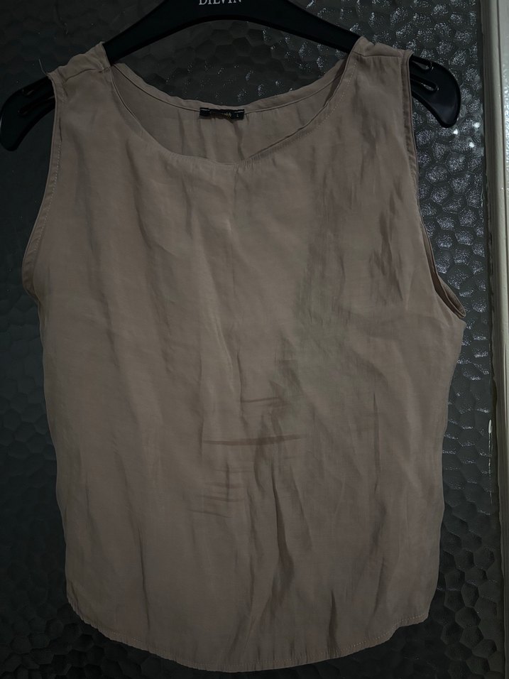 Yumuşak keten kumaştan, kolsuz, bej renkte, yuvarlak yakalı ve rahat bol kesim günlük kullanıma uygun basic bluz.