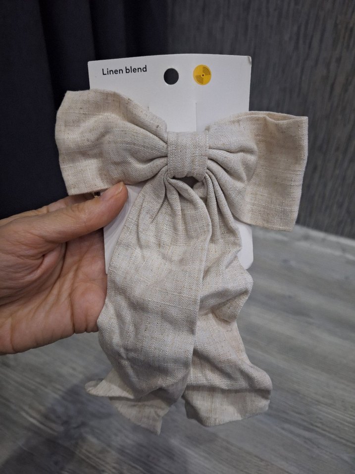 Yumuşak keten karışımı kumaştan yapılmış bej fiyonk saç tokası, minimalist ve bohem tarzda, sade ve temel görünüme uygun.