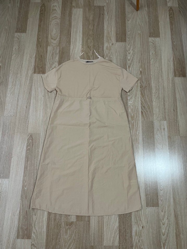 Bej renkli, kısa kollu, keten kumaştan uzun kesim ve bol kalıplı hamile elbisesi. Düz, minimal tasarımıyla günlük kullanım için uygundur. Elbise uzunluğu 115 cm ayarlanabilir bel kısmı