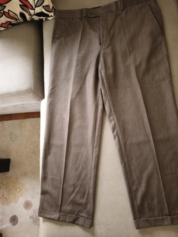 Bej keten kumaştan kemerli, normal boyda ve regular fit erkek pantolon, ofis için uygun klasik tarzda.98 cm bel 96 cm uzunluğunda