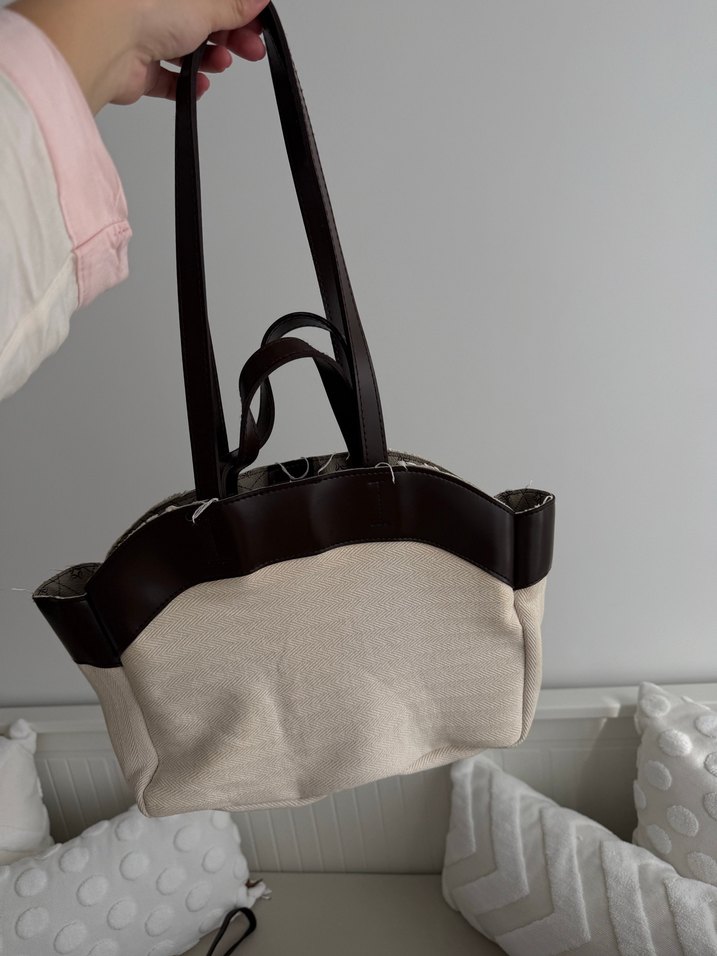 Bej keten kumaştan yapılmış, tokalı koyu kahverengi saplara sahip,