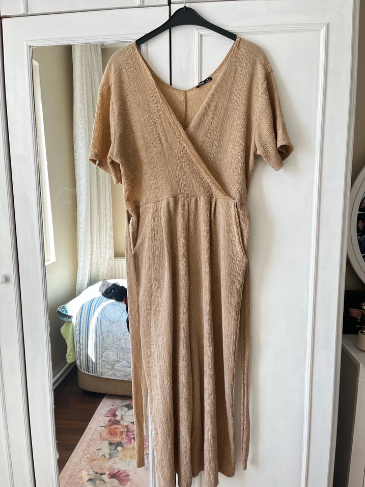 Bej keten kumaştan, bol kesim ve drapeli hamile tulumu. Kısa kollu, V yaka tasarımıyla rahat ve bohem bir görünüm sunar.