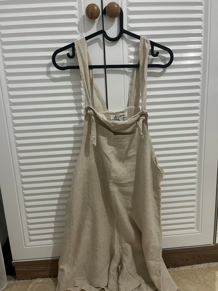 Askılı, keten kumaştan, bej renkte, midi boy ve bol kesim kadın tulum. Minimalist ve bohem tarzda, günlük kullanıma uygundur.