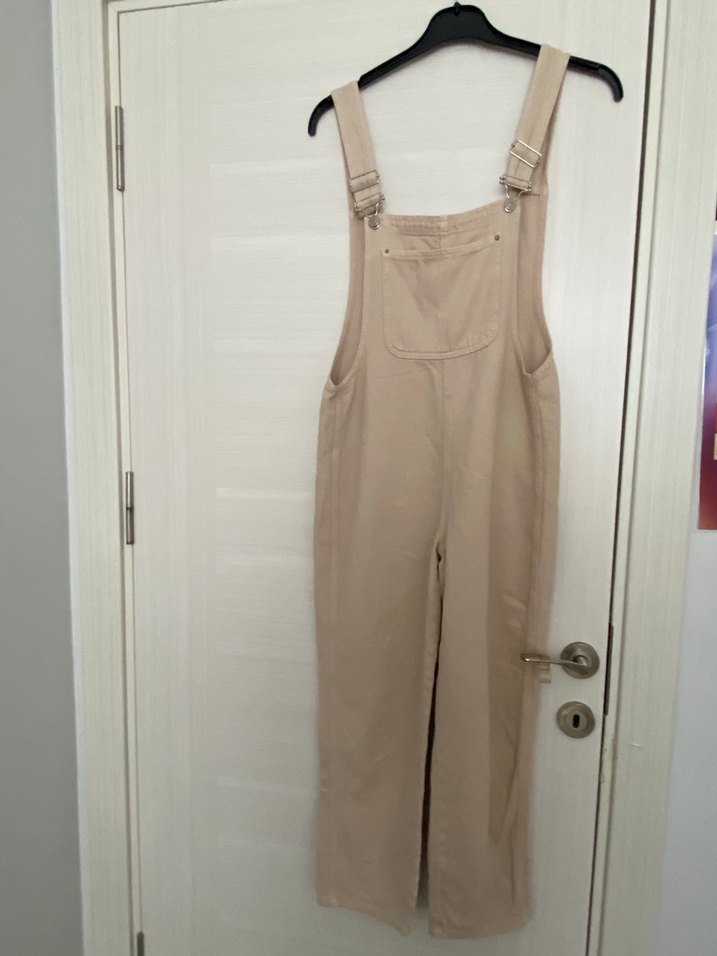 Ayarlanabilir askılı, keten kumaştan bej midi tulum. Rahat kesimi ve minimal tasarımıyla günlük kullanıma uygun.