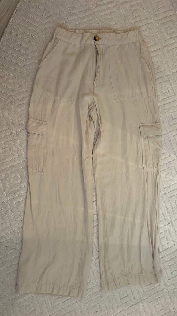 Bej keten midi boy bol kesim kadın pantolon, sade tasarımlı ve yan cepli. Rahat ve günlük sokak stiline uygun. doğum sonrası eski kiloma gelemedim hepsi yep yeni satmak durumundayım gönül rahatlığıyla alabilirsiniz