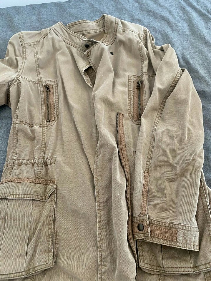 Bej keten kumaştan, düğmeli, uzun kollu, bol kesim ve yakalı midi uzunlukta kadın ceket. Fermuar ve kapaklı cepleri bulunur, günlük kullanıma uygundur.