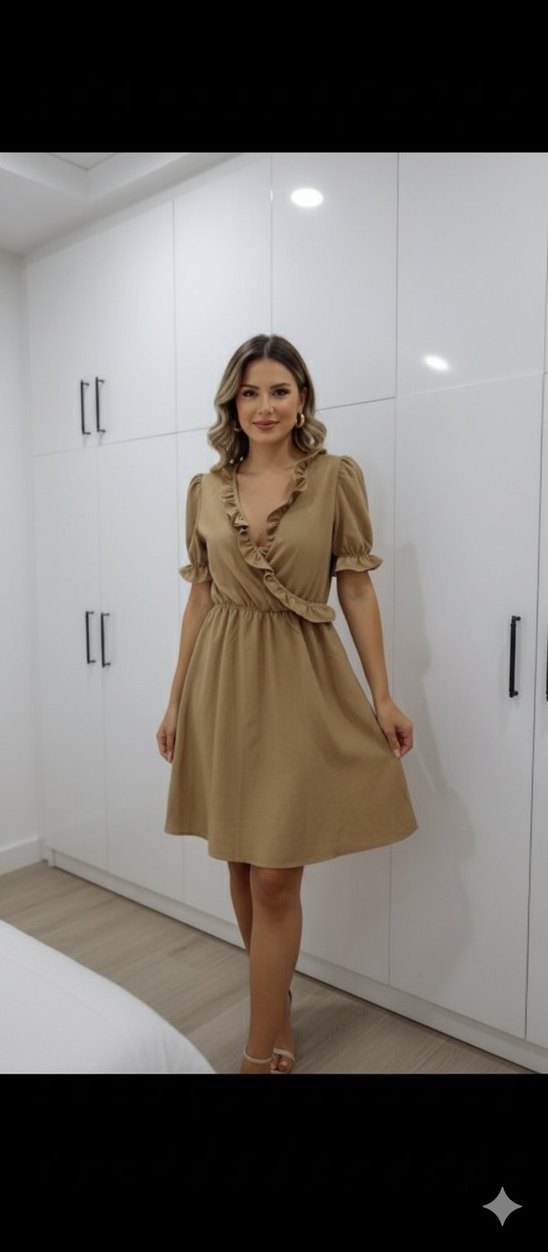 Bej keten midi elbise, V yaka ve fırfır detaylı. Kısa kollu, bol kesim, günlük şık kullanıma uygun pastel tonlu minimalist tarzda. camel renk sıfır hiç giyilmedi