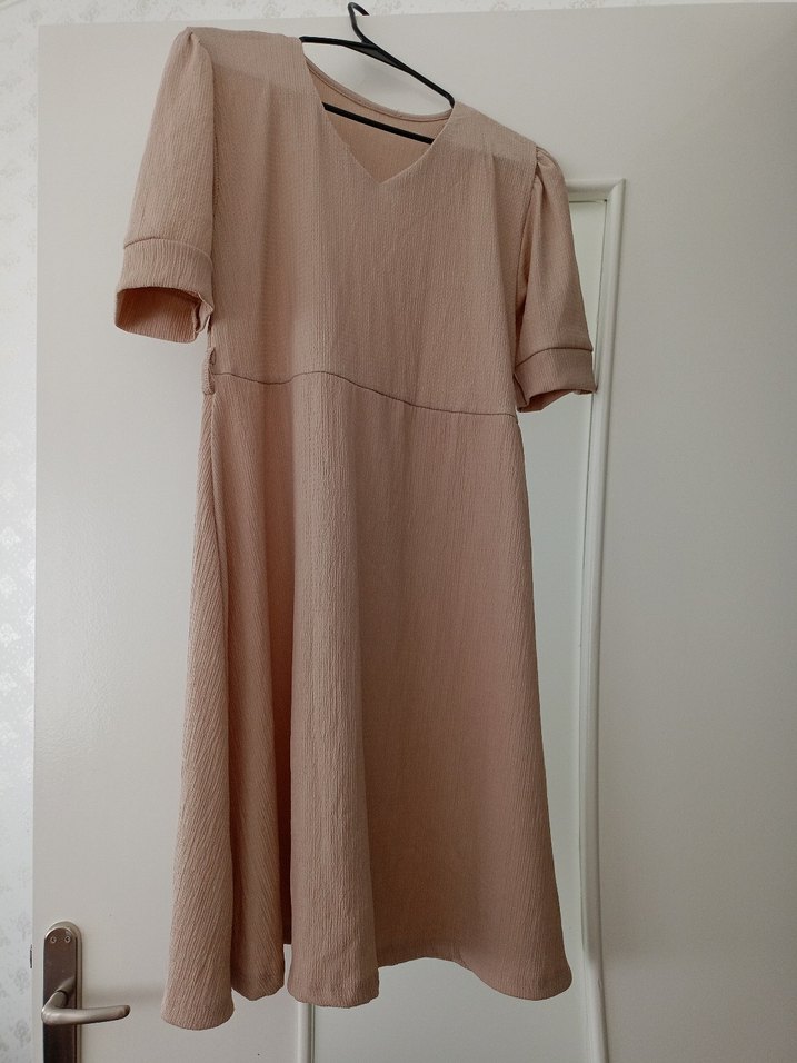 Bej keten midi elbise, bol kesim, kısa kollu ve V yakalıdır. Fullamodadan aldım ve hiç giymedim.