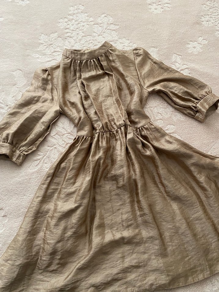 Bej keten midi elbise, yüksek yakalı ve fırfır detaylıdır. Salaş kesim ve askılı kollara sahip, bohem tarzda. Günlük kullanım için uygundur.
