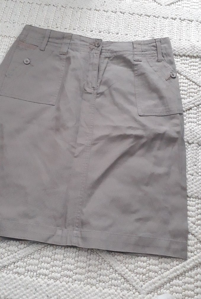 Bej keten midi eteği, bol kesim ve kemerli bele sahip, gündelik normcore tarzda dış mekan kullanımı için uygundur.