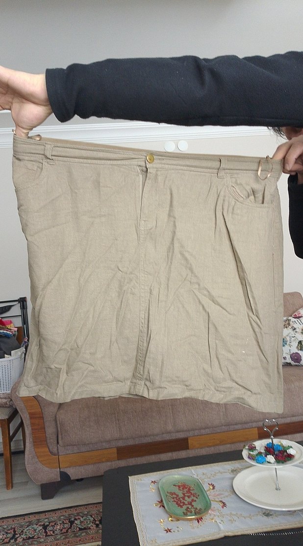 Bej renkte keten hamile eteği, bol kesim ve kemerli bel detayına sahiptir. Midi boyda, desensiz ve günlük bohem tarz için uygundur.