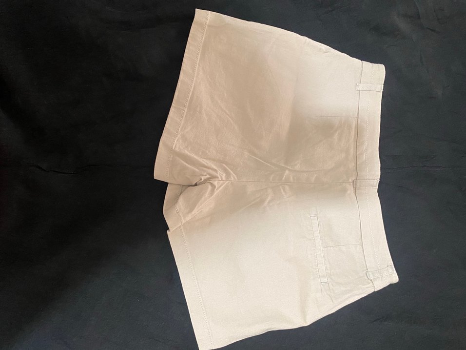 Bej keten hamile şortu, midi boy ve dar kesimlidir. Günlük sokak stiline uygun sade ve minimalist tasarım sunar.