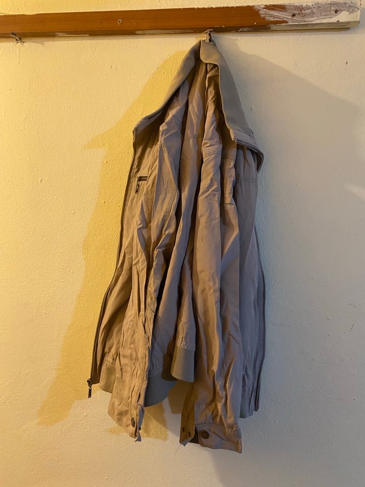 Bej keten kumaştan kadın ceket, drapeli tasarım, yakalı ve uzun kollu. Bol kesim ve midi boy, sokak stili ve günlük kullanım için uygun. Minimalist ve şık tarz.