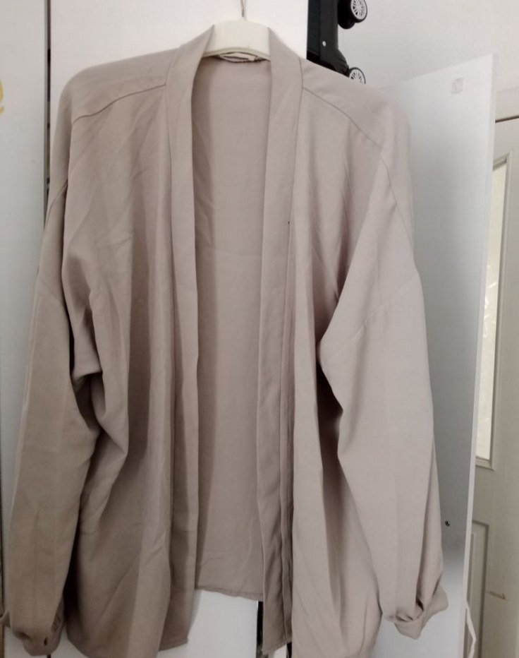 Bej keten kumaştan, bol kesim, drapeli midi kadın ceket. Uzun kollu ve yakası kesik detaylı, minimalist ve desensiz tarzda günlük kullanım için uygun.