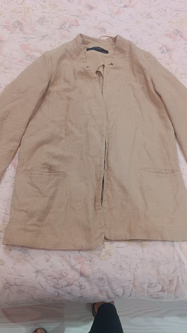 Bej keten kumaştan, düğmeli, normal midi boyda, uzun kollu bol kesim ceket. Minimalist ve sade tasarım, günlük kullanıma uygun. orijinal Zara eni 50 boyu 75 santim taptaze hiç kullanılmadı neredeyse