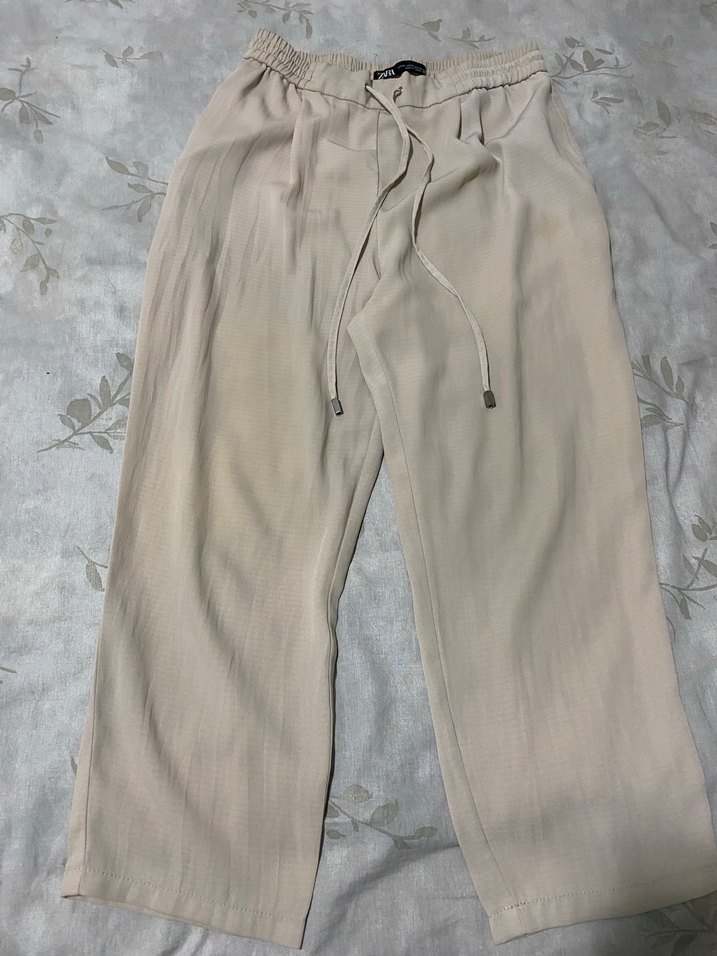Bej keten kumaştan, bol kesim ve midi boy kadın pantolon. Rahat lastikli beli ve bağcığıyla günlük kullanıma uygun, zahmetsiz şıklık sunar.