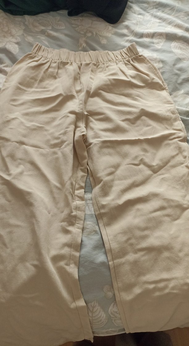 Bej keten kumaştan, midi boy, bol kesim ve lastikli beliyle rahat ve şık kadın pantolonu.
